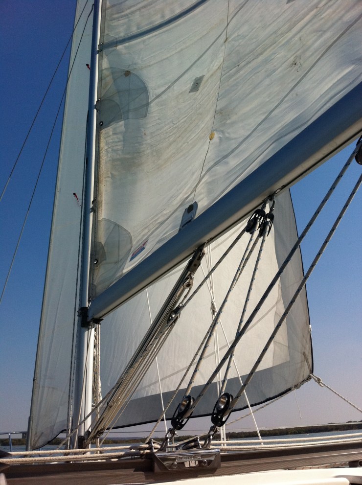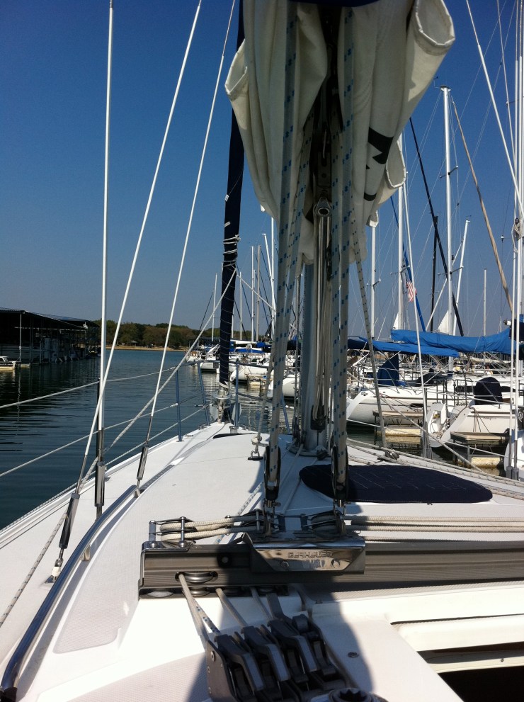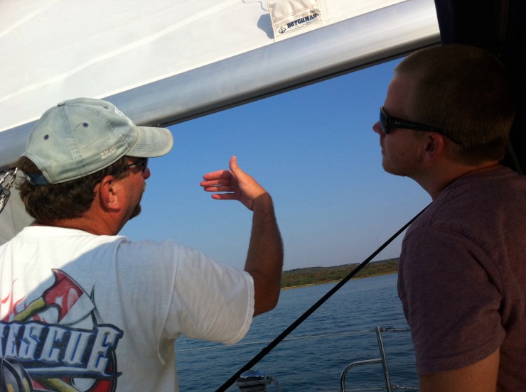 We went sailing yesterday! We met James and Debbie at their boat slip at 4:15 p.m. for a sailing race across Joe Pool Lake and back. As it turns out, there was about ZERO wind, but we still went out and learned a whole lot. It is amazing how far you can go even when it seems like the wind isn’t blowing at all. James and Debbie are the sweetest people, and super helpful. They are great teachers – even without wind in the sails. I was so pleased because I could tell all my hard work studying has really paid off already. I knew what James was talking about the whole time!