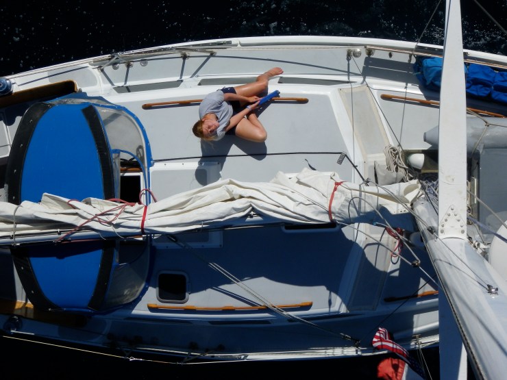 We discovered a few things we need to fix before we take off too far. The boom doesn’t really have an effective system to be held up properly. Right now, the mail sail was holding it up. This isn’t a great idea because it will wear out the main sail, so we need to add a topping lift or fix our boom vang. We also found out the hard way that our pulleys need stoppers on the slide rails they are on. One popped off the end and hit Tim in the hand. Not good.