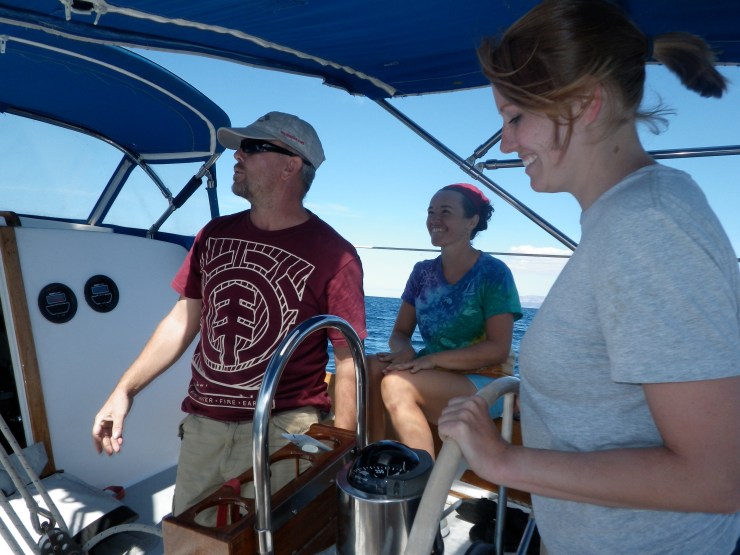 As it turned out, we do not have a topping lift, which holds the boom up. But at least we learned a thing or two. So Tim scooted down with the help of the bosun’s chair and we raised the sails. Jasna and Rick were great teachers and showed us the proper way to regularly handle communication aboard. Communication is one of the most important parts of sailing. We practiced tacking – turning the boat left or right while heading into the wind – and jibing – turning the boat left or right while heading downwind. We tacked back and forth several times with me at the helm and then Tim at the helm. It was really quite tiring. Jibing is a bit trickier because there is an element of danger if you do not handle it properly. The mail sail can come crashing across the boat, especially in high winds. This could hurt someone or break the boom if you are not careful. When getting ready to tack or jibe you should say,”Stand by to tack/jibe.” The crew prepare the lines and makes sure they are paying attention. Then the helmsman says “Ready to tack/jibe.” Crew says, “Ready,” and then you turn the wheel. As I turn Tim hurries to let out one side of the jib and then pulls the other side until it is trimmed up for our new course. It sounds more complicated than it really is. It is important to get right, but not really complicated.