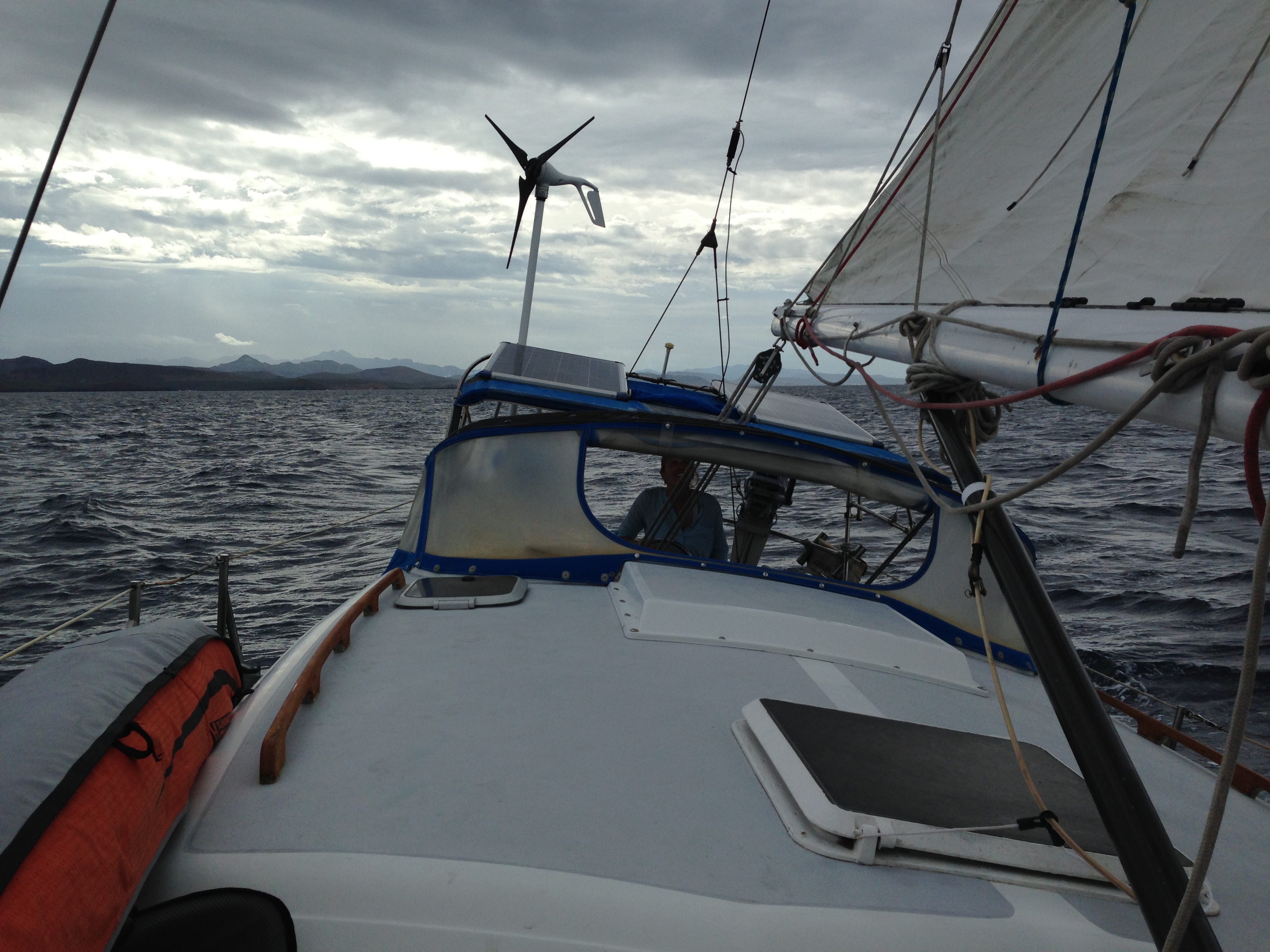 After squashing what we thought were all of our obstacles to getting out to the islands near La Paz for a more relaxing “vacation” part of our trip, we set sail on a cloudy day. It was a nice sail slightly upwind, so we planned to sail out on one tack and motor back into anchor, as we were feeling lazy and didn’t want to sail upwind the whole way.