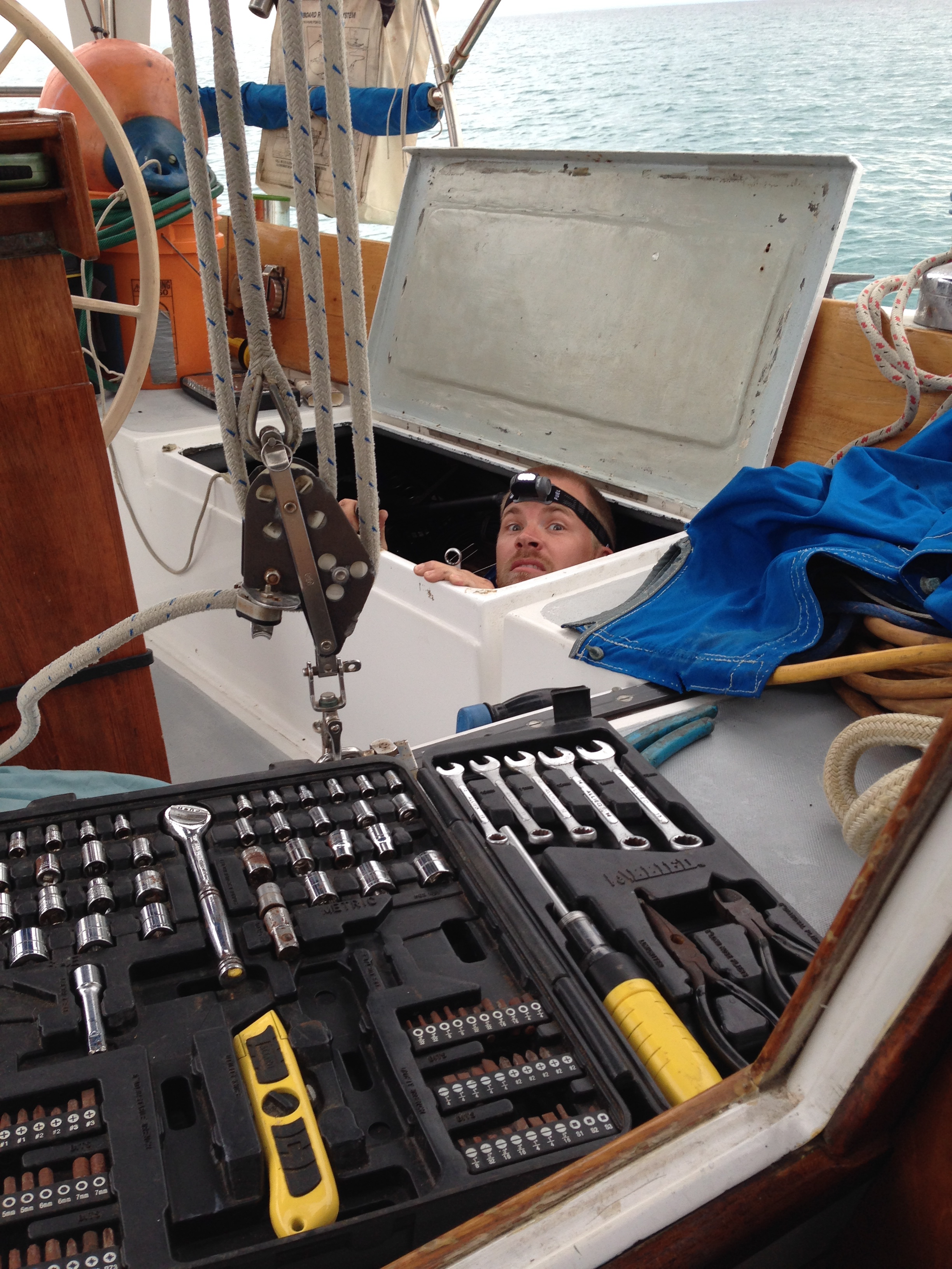 I had already reached my maximum stress load and freaked out about 10 minutes before we lost the boom. So, I stayed strangely calm, sailing the boat into the mouth of a different, calmer anchorage where Tim was able to replace the alternator belt before we got too close to land. This allowed us to motor (hobble) the rest of the way to anchor. After a day like that, there was no way we could come on the VHF radio and hail with the name “Luckiest.” We decided at that moment we must rename our boat. We called Calypso, who had already anchored in our intended spot. They came down right away to help us lick our wounds. We were happy to have their help, and we all stayed a couple of days to relax.