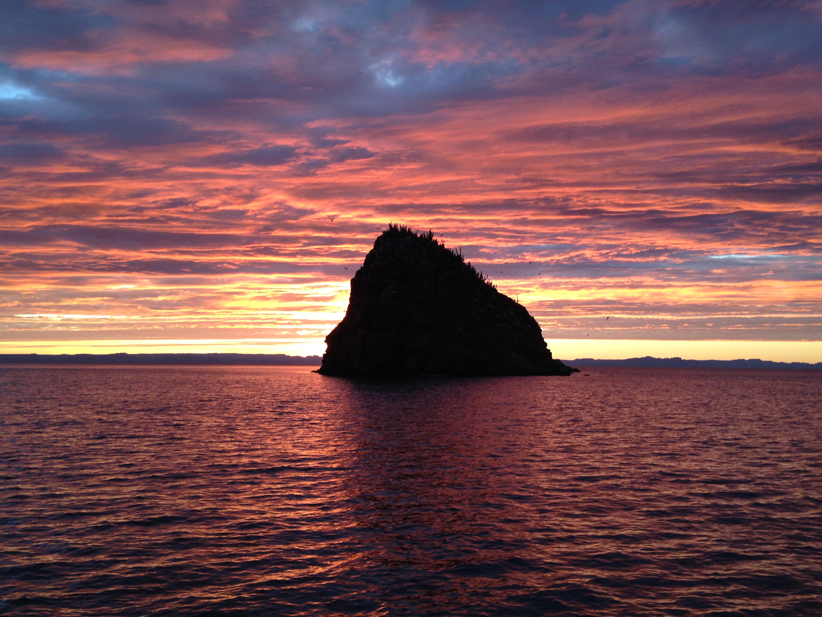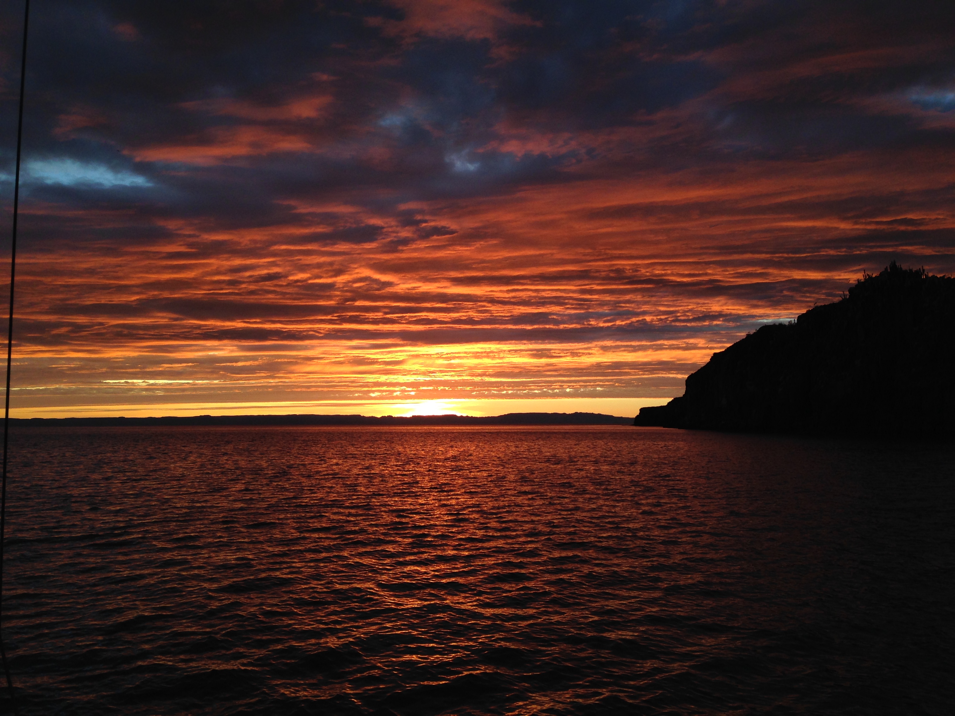 After motoring for maybe 30 minutes, our engine began overheating and spewing coolant. We immediately killed the engine and began sailing toward the nearest anchorage, unsure what the issue was. We sailed upwind in light winds all the way to anchor in Bahia San Gabriel. The engine had finally cooled enough for Tim to get in and take a look. It turned out to be an easy fix of installing a new alternator belt, allowing us to motor up to a safer anchorage with more wind protection just before one of the more beautiful sunsets.