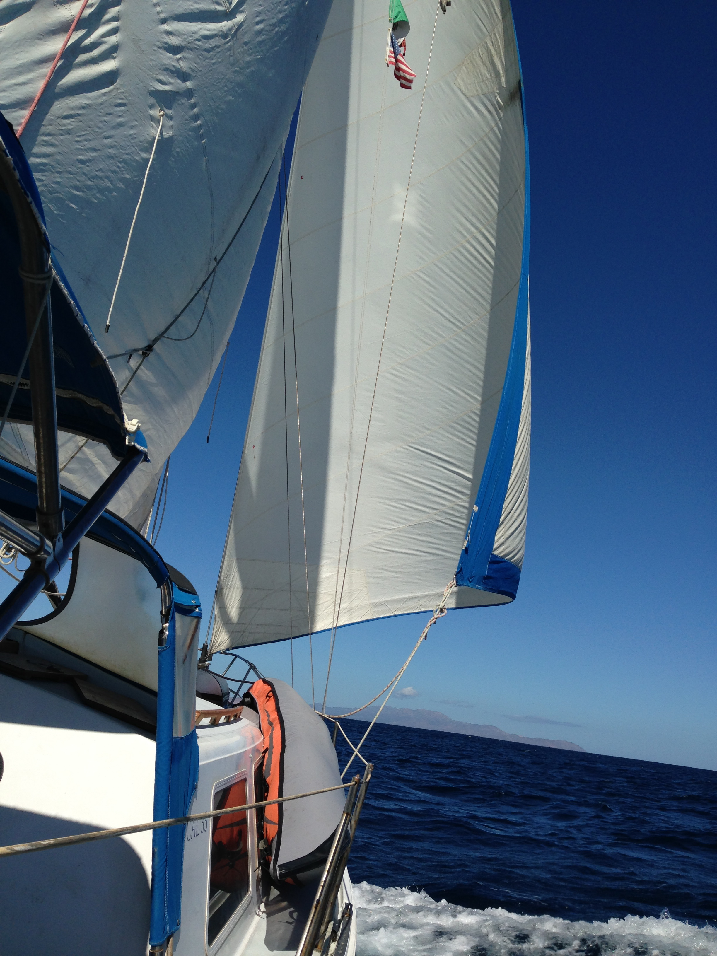 The wind was getting pretty strong as we and Calypso — both with only headsails out — headed down to Isla Partida. As we finally approached our intended anchorage, we attempted turning into the wind with hopes of getting close enough to safely to drop anchor. This was a big mistake. The wind had picked up over 20 knots and we didn’t have any power without our main sail up. So we raised the main with the boat pointing downwind — a little dangerous maneuver because the chances for a accidental jibe are high. That is exactly what happened. We accidentally jibed hard, popping the boom right off the mast.